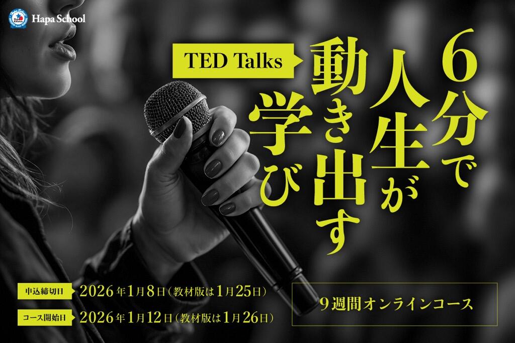 大人気オンライン学習プログラムHapa Schoolが、2026年冬期コース受講生の募集を開始しました。1月12日からスタートするHapa School冬学期のテーマは、「TED Talks – 6分で人生が動き出す学び」!6分以内で見られる超短編TED Talksを視聴しながら、英語の語彙力・リスニング・表現力をバランスよく強化していきます。